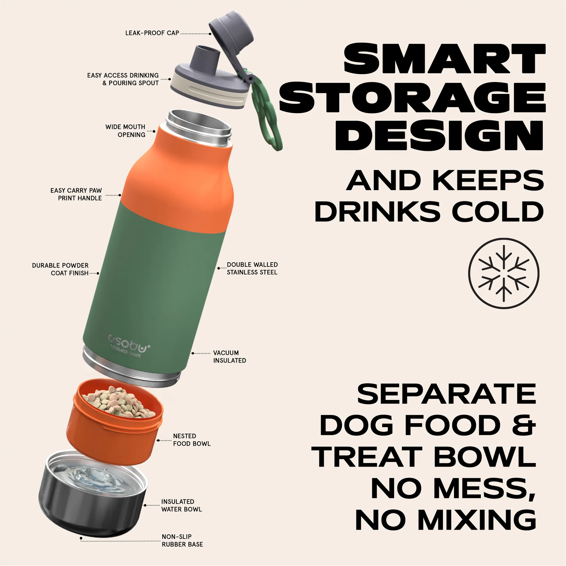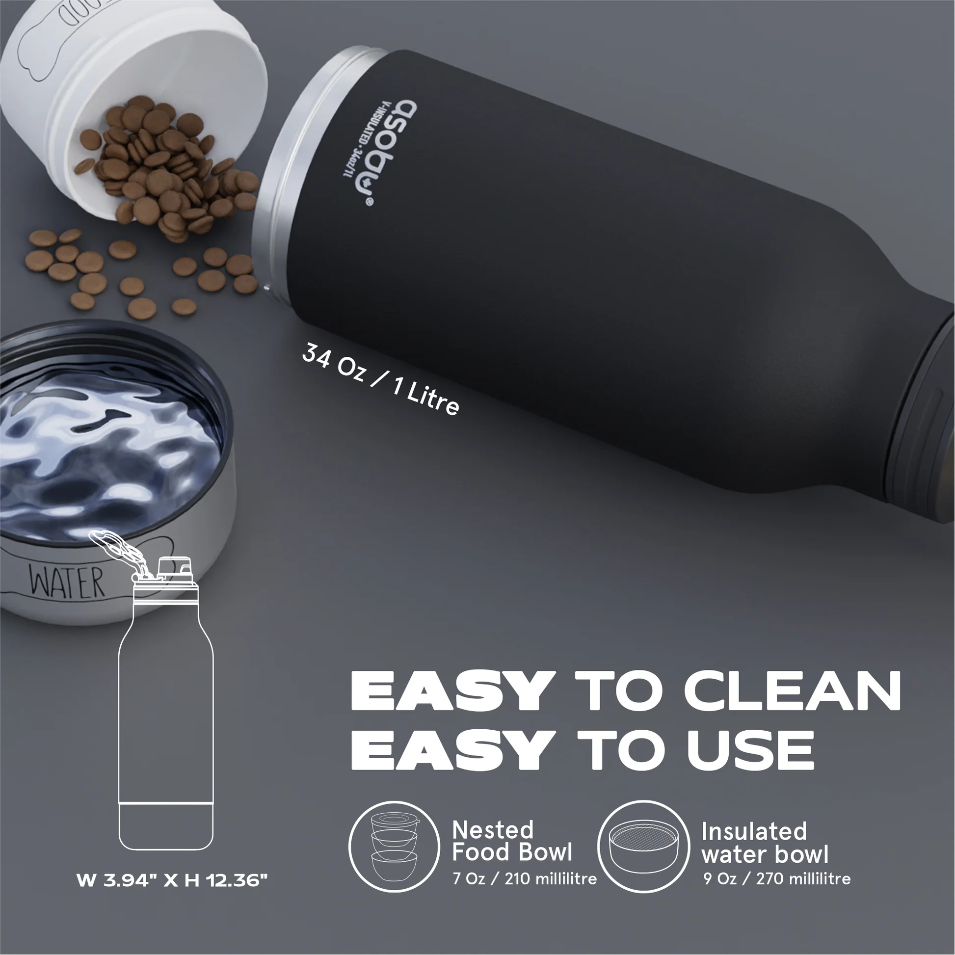 Funkcja 3w1: butelka termiczna, miska na wodę i miska na karmę Pojemność butelki: 1 l Miska na wodę: 270 ml | Miska na jedzenie: 210 ml Izolacja próżniowa z miedzianą warstwą - utrzymuje temperaturę napojów przez wiele godzin Wykonana z wysokiej jakości stali nierdzewnej i silikonu Materiały w 100% bezpieczne dla ludzi i zwierząt (BPA FREE) Szczelna konstrukcja - odporna na przeciekanie Poręczny uchwyt w kształcie psiej łapy - wygodne przenoszenie Łatwe czyszczenie - zalecane mycie ręczne Wysokość: 32 cm | Średnica: 10 cm