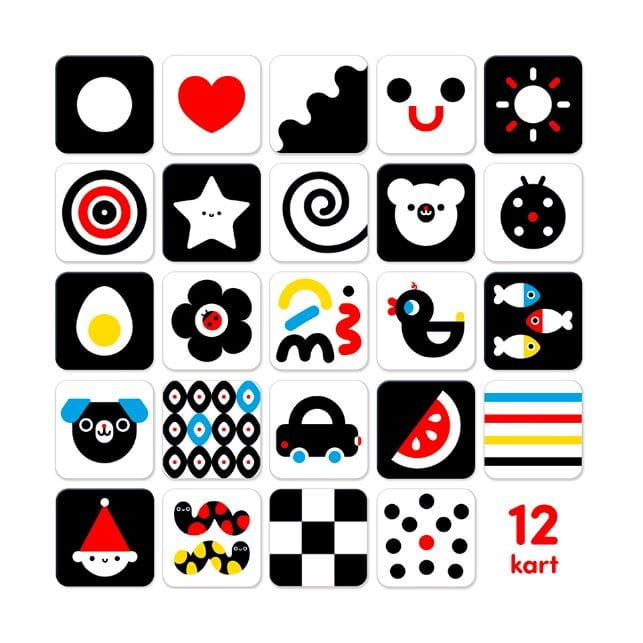 Zestaw zawiera duże, sztywne karty z bezpiecznymi, zaokrąglonymi rogami. Można je prezentować dziecku w łóżeczku, na macie do zabawy lub w wózku. Oglądanie kontrastowych ilustracji pomaga niemowlęciu ćwiczyć skupienie wzroku, koncentrację oraz rozpoznawanie kształtów i konturów.