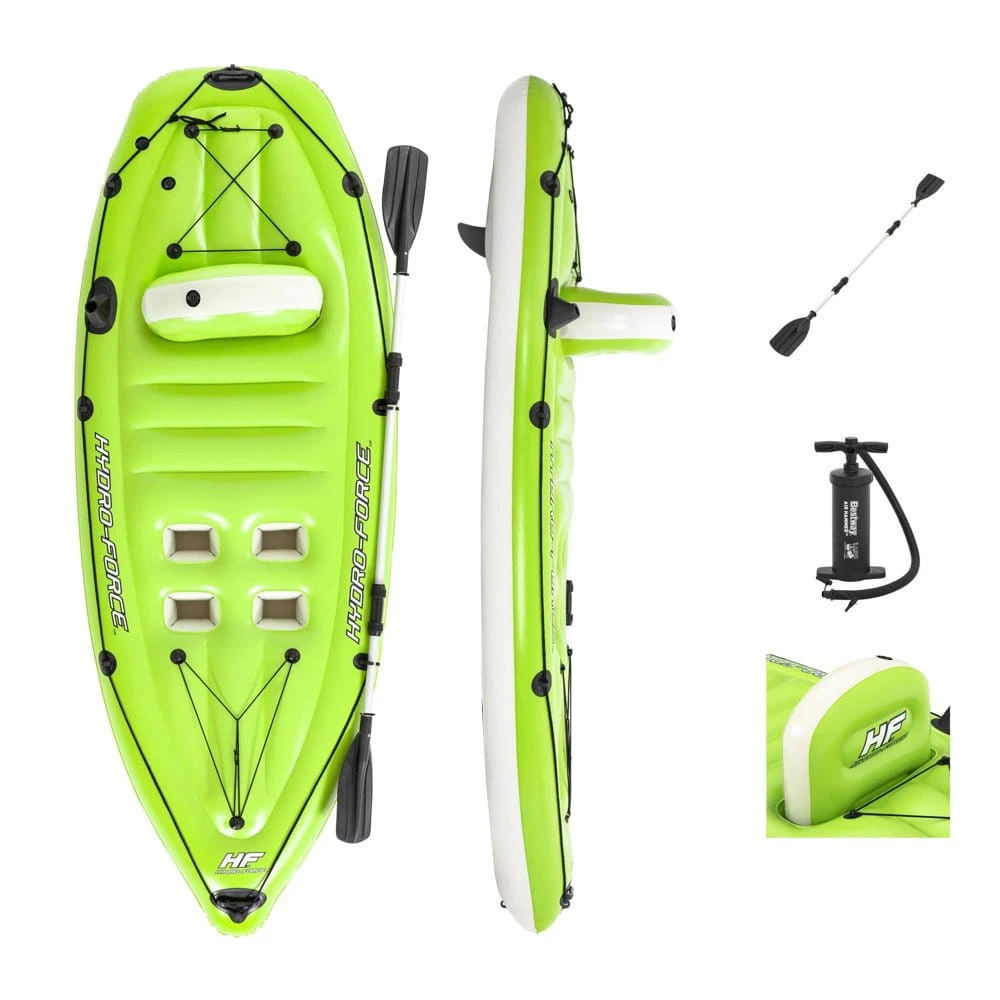 Wyjazd nad wodę to idealna forma spędzania wolnego czasu. Aby urozmaicić sobie ten beztroski czas zaopatrz się w dodatkowe akcesoria basenowe. Kajak przeznaczony jest do wędkowania na wodzie. Idealnie sprawdzi się również podczas rekreacyjnej wycieczki po jeziorze lub basenie. Został wykonany z wytrzymałego winylu odpornego na uszkodzenia. Teraz możesz wygodnie łowić, wraz z wbudowanym uchwytem na wędkę i zapięciami do wiosła. Kajak ma również nadmuchiwane oparcie dla maksymalnego relaksu oraz 4 podnóżki, aby pomieścić użytkowników o różnym wzroście Jest idealny do transportu i kompaktowego przechowywania. Dodatkowo płetwa grzbietowa jest odpinana, co jeszcze bardziej ułatwia przechowywanie tego kajaka. Ten zestaw zawiera również pompkę ręczną Air Hammer ™ do prostego, szybkiego pompowania, wiosło i łatkę naprawczą.