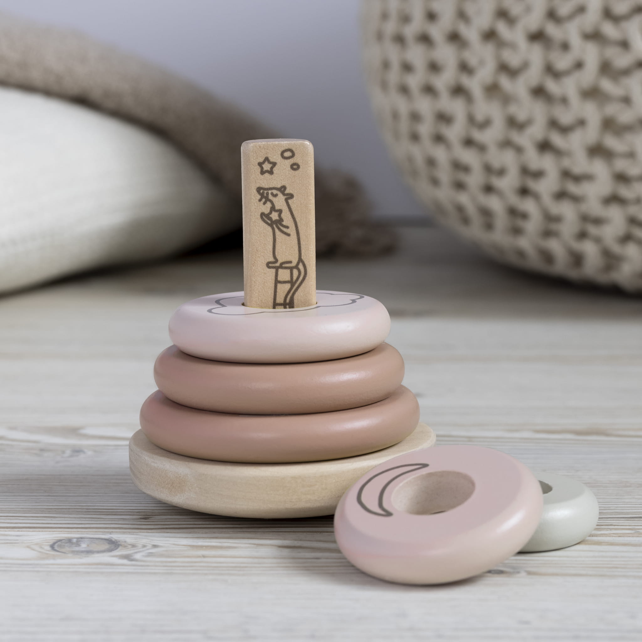 Drewniana różowa układanka szwedzkiej marki Micki to klasyczna zabawka, która zachęca do radosnej zabawy i rozwija zdolności manualne oraz koordynację ruchową malucha. Zabawka składa się z podstawy z palikiem po środku, na który dziecko nakłada kolejno kółka w różnych rozmiarach. Tak powstaje prawdziwa piramida! Zestaw składa się z 6 elementów w pastelowych kolorach, które pobudzają wyobraźnię i angażują do zabawy. Układanka została starannie zaprojektowana z myślą o rozwoju zdolności manualnych i koordynacji ruchowej najmłodszych dzieci, a trwała konstrukcja zapewnia niekończącą się radość Twojego maluszka.