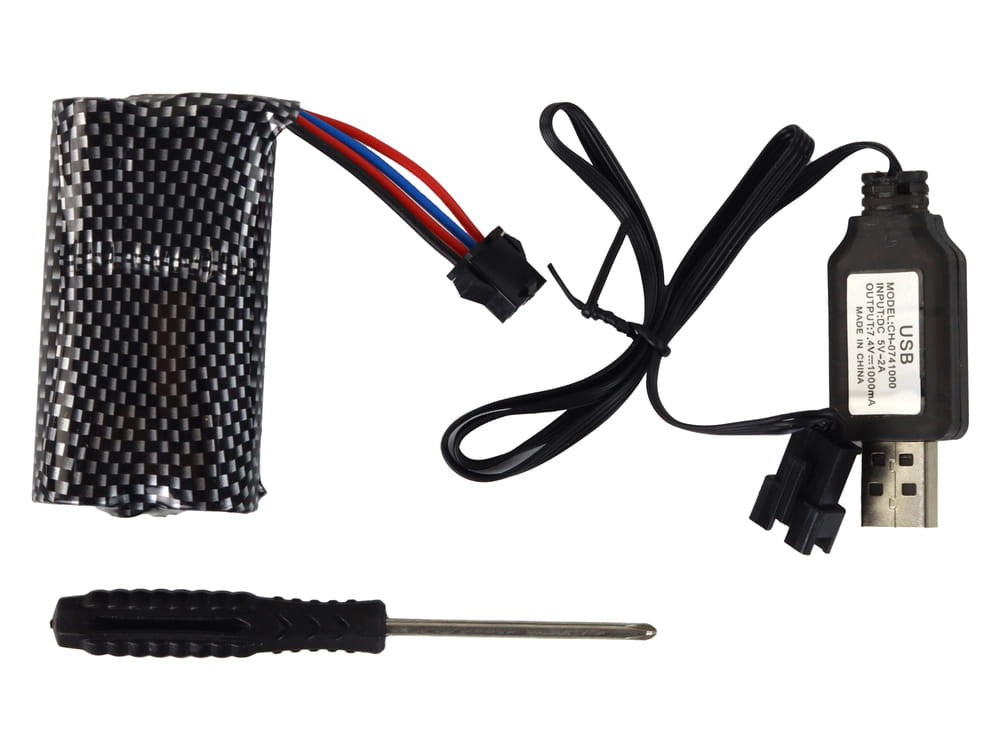Pistolet zasilany jest na akumulator 7.4V, który jest elementem zestawu. Do akumulatora dołączona jest oryginalna ładowarka.