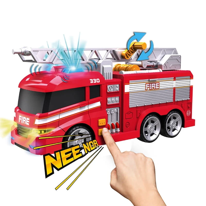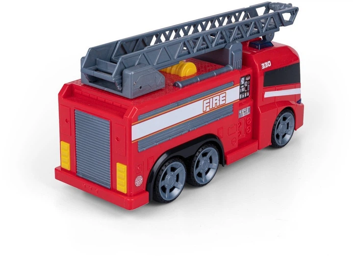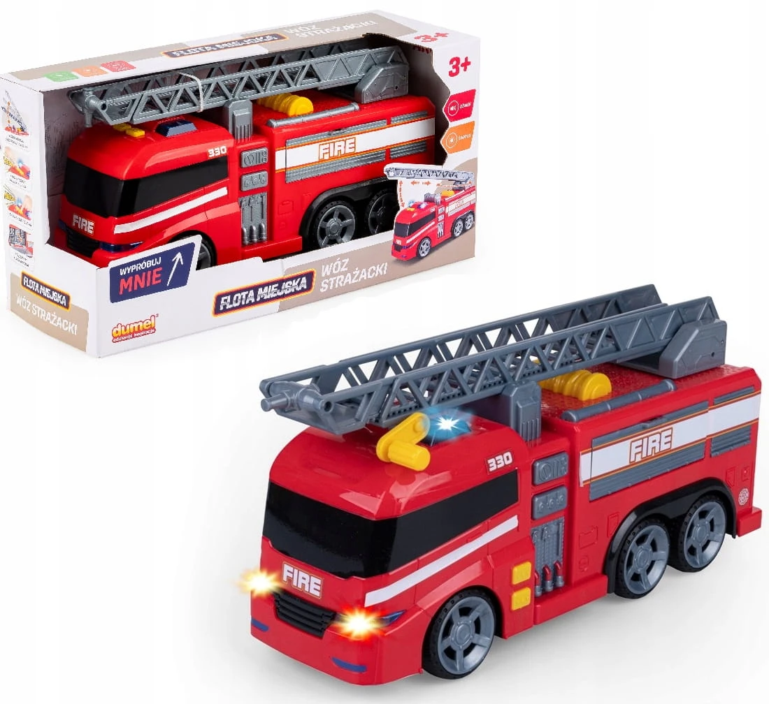 Duży samochód straży pożarnej z dźwiękiem i światłami — wysuwana drabina, otwierany bok (wiek 3+)