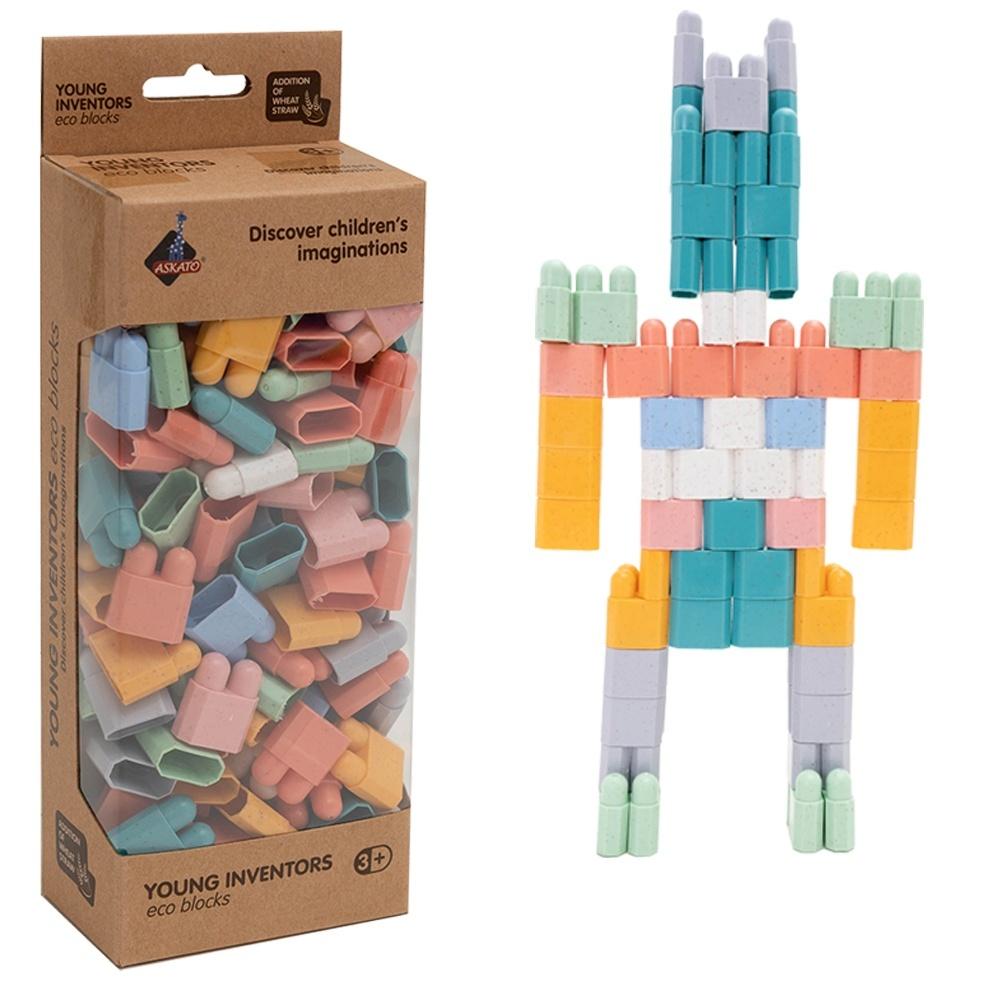 Zestaw zawiera 150 elementów, które umożliwiają tworzenie nieskończonych konstrukcji. Wykonane z ekologicznych materiałów klocki są przyjazne dla środowiska i trwałe, co zapewnia długotrwałą zabawę.