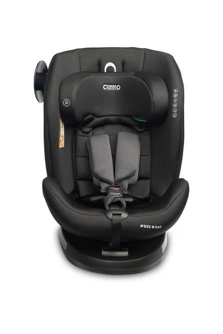 Caretero COMMO to nowoczesny fotelik samochodowy z wymagającą homologacją i-Size. Fotel jest przeznaczony dla dzieci od pierwszych miesięcy życia (od 40 cm) aż do momentu, w którym fotelik nie jest już wymagany, czyli osiągnięcia 150 cm wzrostu. Montaż w samochodzie jest bardzo łatwy i szybki dzięki zaczepom ISOFIX oraz pasowi TopTether z dodatkową klamrą z sygnalizacją dźwiękową. Siedzisko z możliwością obrotu 360 stopni gwarantuje wygodę umieszczania dziecka w foteliku. Komfort najwyższej klasy jest zapewniany przez wygodną wkładkę z regulowanym zagłówkiem. Tapicerka została wykonana z wysokiej jakości tkaniny poliestrowej gwarantując dziecku wygodę jazdy. Dzięki wielostopniowej regulacji zagłówka fotelik może być idealnie dopasowany do wzrostu dziecka, zapewniając prawidłowe podparcie okolic szyi i głowy. Commo posiada 5 stopni pochylenia zarówno w pozycji przodem, jak i tyłem do kierunku jazdy. Klamra 5-punktowych pasów fotelika została wyposażona w sygnalizator dźwiękowy, który zacznie piszczeć w momencie ich rozpięcia. Dodatkowym atutem jest boczna nakładka SIP (Side Impact Protection), która umieszczona na bocznej ściance fotelika gwarantuje zwiększone bezpieczeństwo w przypadku kolizji drogowej.