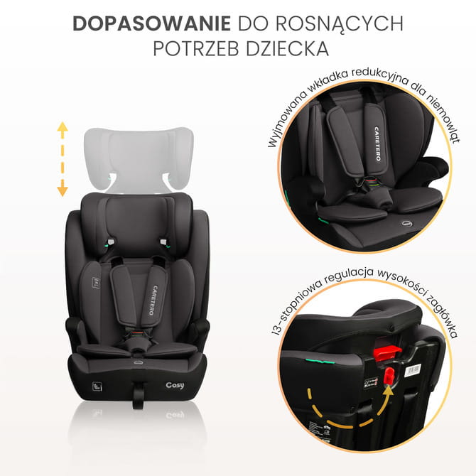 Fotelik samochodowy z dodatkową wkładką redukcyjną dla niemowlaka to doskonałe rozwiązanie zapewniające bezpieczeństwo dla najmłodszych. Wkładka zapewnia dodatkowe wsparcie i komfort dziecka, utrzymując ciało w odpowiedniej, ergonomicznej pozycji. Dzięki 13-stopniowej regulacji wysokości zagłówka, fotelik Cosy rośnie razem z dzieckiem, zapewniając idealne dopasowanie do aktualnych potrzeb dziecka.
