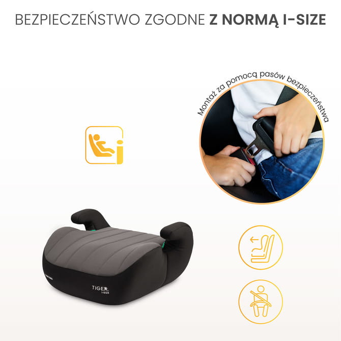 Fotelik dziecięcy Tiger i-Size typu booster to ergonomicznie zaprojektowane rozwiązanie dla starszych dzieci, kóre osiągnęły odpowiednią wagę i wzrost, umożliwiające przejście z tradycyjnego fotelika do podkładki.