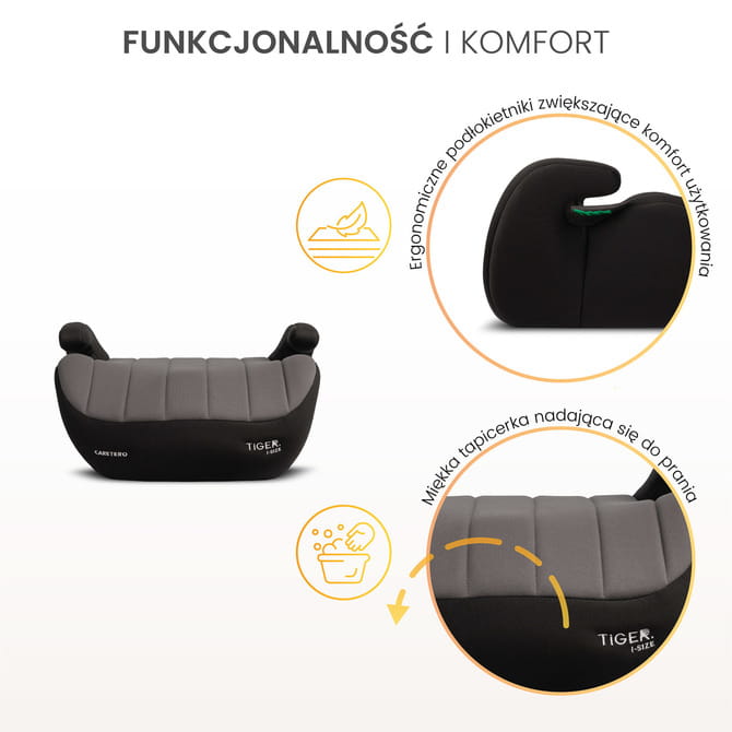 Fotelik dziecięcy Tiger i-Size typu booster to ergonomicznie zaprojektowane rozwiązanie dla starszych dzieci, kóre osiągnęły odpowiednią wagę i wzrost, umożliwiające przejście z tradycyjnego fotelika do podkładki.