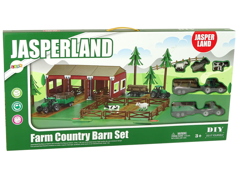 Zestaw zawiera stodołę, zagrodę dla zwierząt, dwa traktory i akcesoria rolnicze, które pozwalają tworzyć realistyczne scenki z życia na wsi. Dzięki bogatemu wyposażeniu dziecko może odgrywać role rolnika, opiekować się zwierzętami, przewozić paszę i wykonywać codzienne prace na farmie.