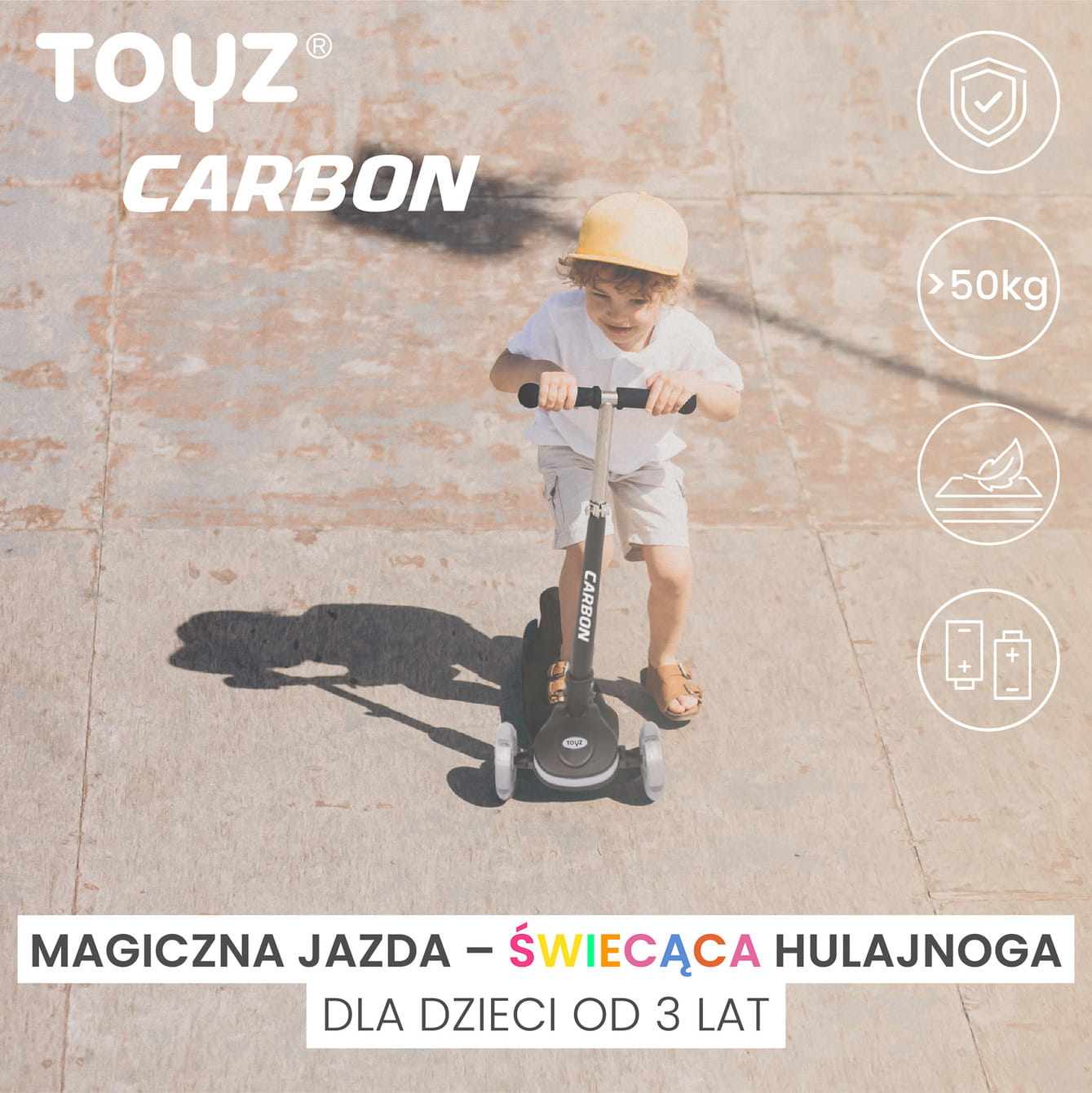 Hulajnoga Carbon jest doskonałym wyborem dla dzieci od 3 roku życia. Posiada 3-stopniową regulację kierownicy, co pozwala na dostosowanie jej wysokości do wzrostu dziecka. Dzięki temu zapewnia ergonomiczną pozycję podczas jazdy i wydłuża okres użytkowania.