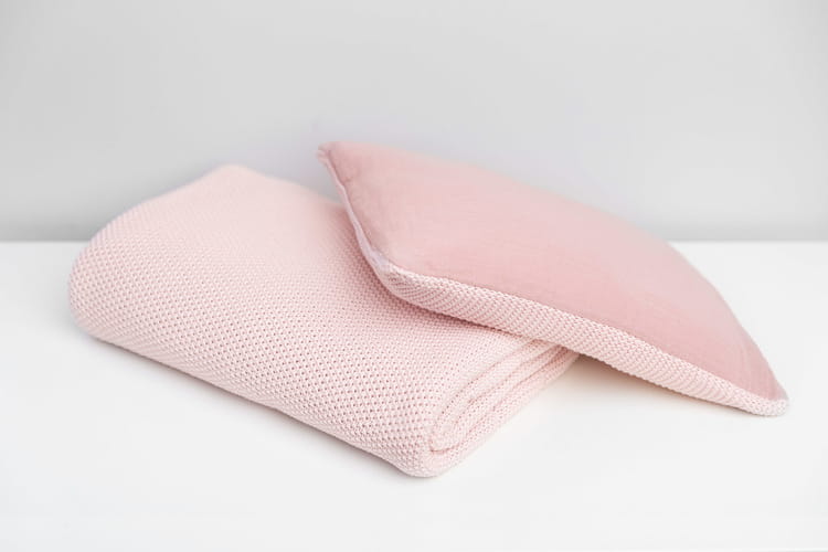 KOMPLET DO ŁÓŻECZKA DZIERGANY Z MUŚLINĄ RÓŻOWY