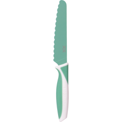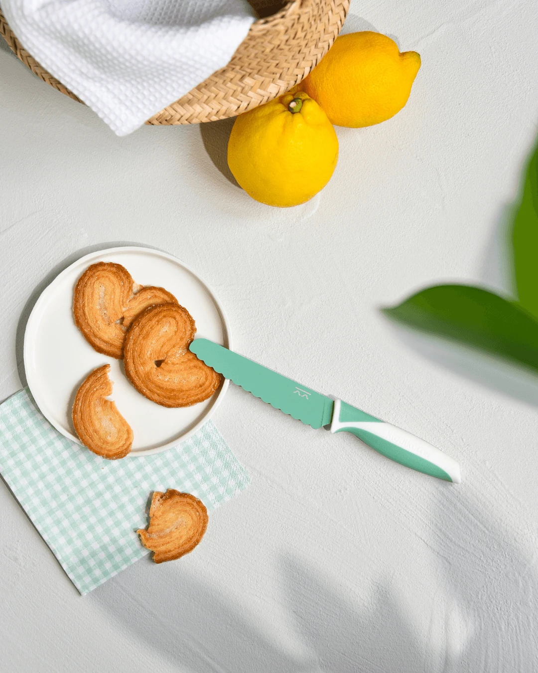 Ostrze wykonane ze stali nierdzewnej ma zaokrąglone, ząbkowane krawędzie - bez ostrych elementów. I to ze wszystkich stron: górnej, dolnej, bocznych i czubka. Cokolwiek się wydarzy przy stole, palce są bezpieczne. Ostrze działa w ruchu piłującym lub siekającym, utrzymując stały kontakt z jedzeniem. Dzięki temu krojenie jest skuteczne i płynne, a jednocześnie bezpieczne dla małych dłoni.