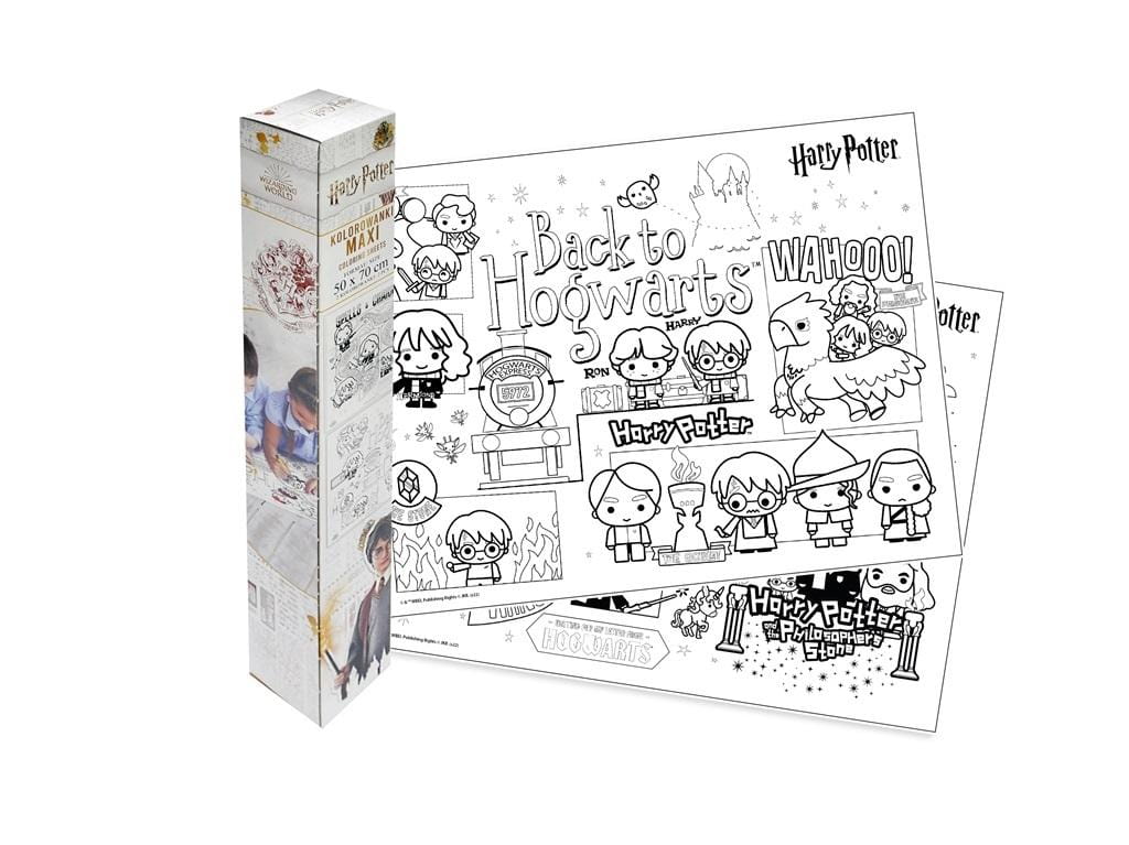 Wielkoformatowa kolorowanka wykonana z grubego, białego papieru. Możliwość pracy kilku osób jednocześnie. Profesjonalna grafika, wyraźny druk w kolorze czarnym. Rolowany bez zagnieceń. W tekturowej tubie chroniącej przed zniszczeniem. Odpowiedni do kolorowania kredkami, flamastrami, markerami i farbami. Na kolorowance znajdują się ulubieni bohaterzy z serii Harry Potter.