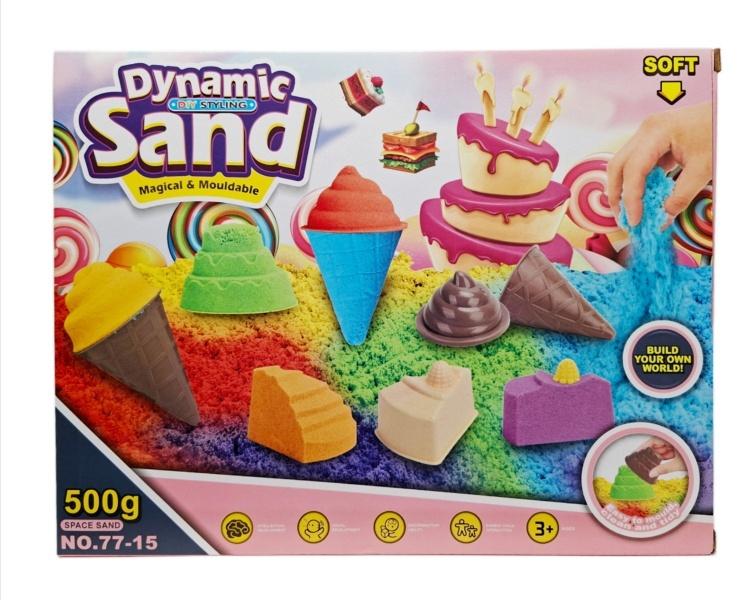 Kolorowy piasek kinetyczny 500 g z foremkami do tworzenia deserów i kształtów. Zapakowany w kartonowe pudełko. Zabawka przeznaczona dla dzieci od lat 3. Podane wymiary są wymiarami opakowania.