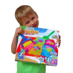 - w zestawie: pachnący piasek kinetyczny w pięciu kolorach, 6 plastikowych foremek, 1 zabawkowa łyżka, 1 zabawkowy wałek i 1 mata;