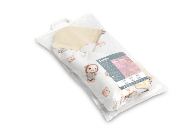 Jednostronny rożek niemowlęcy Muślin został stworzony z myślą o noworodkach i niemowlętach. Zapięcie na rzep umożliwia wygodne trzymanie dziecka podczas karmienia i usypiania. Po rozłożeniu, rożek może być z powodzeniem stosowany jako kołderka do łóżeczka czy wózka dziecięcego. Może także służyć jako mata do zabawy. Wykonany został z tkanin bawełnianych: bawełny drukowanej oraz muślinu. Wypełnienie rożka to antyalergiczna włóknina puszysta silikonowa. Wysoką jakość wykonania podkreśla estetyczna wypustka
