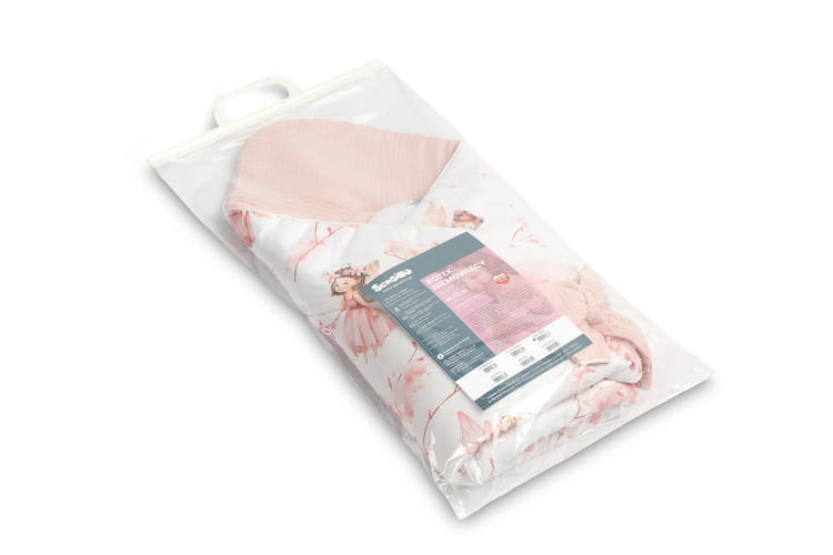 Jednostronny rożek niemowlęcy Muślin został stworzony z myślą o noworodkach i niemowlętach. Zapięcie na rzep umożliwia wygodne trzymanie dziecka podczas karmienia i usypiania. Po rozłożeniu, rożek może być z powodzeniem stosowany jako kołderka do łóżeczka czy wózka dziecięcego. Może także służyć jako mata do zabawy. Wykonany został z tkanin bawełnianych: bawełny drukowanej oraz muślinu. Wypełnienie rożka to antyalergiczna włóknina puszysta silikonowa. Wysoką jakość wykonania podkreśla estetyczna wypustka