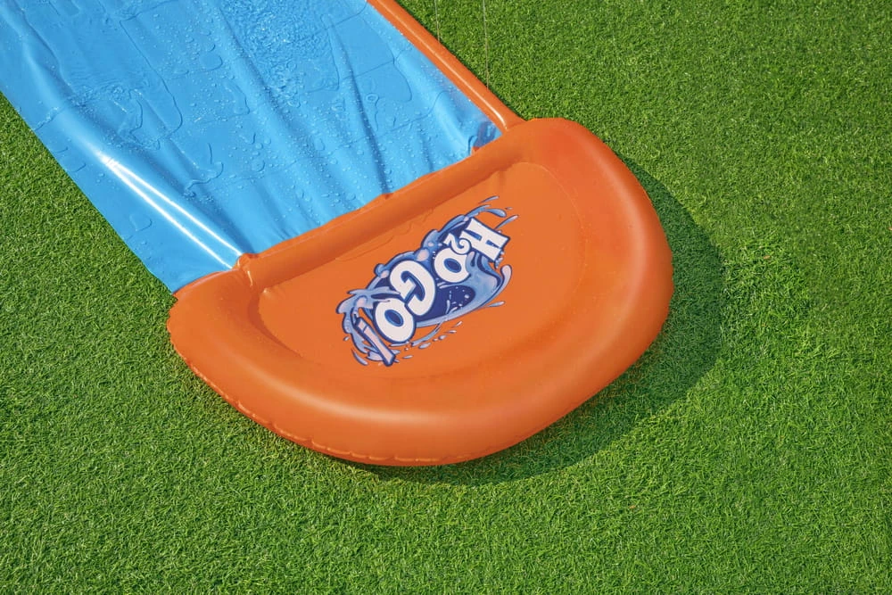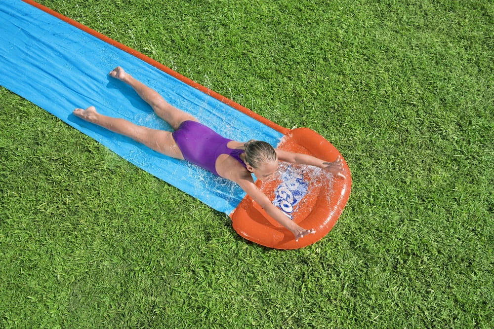 Ślizg o długości 4,88 m jest idealny do samotnych prób szybkości lub zabawy na zmianę z przyjaciółmi. Lejki wodne w baseniku na końcu powodują lądowanie z wielkim pluskiem na linii mety. Wbudowane spryskiwacze są specjalnie zaprojektowane w celu bardziej wydajnego pokrycia i zapewniają efekt kaskadowy, utrzymując śliski tor. Ślizg zapewni klasyczną, ponadczasową zabawę na podwórkach dla wszystkich dzieci w wieku powyżej 3 lat. Będzie to idealna forma spędzenia wolnego czasu i ciekawa rozrywka. Ślizgawkę wystarczy rozwinąć, przytwierdzić do podłoża i podłączyć wąż ogrodowy. Dzięki dołączonym do zestawu specjalnym zabezpieczeniom ślizgawka nie będzie się przesuwała.