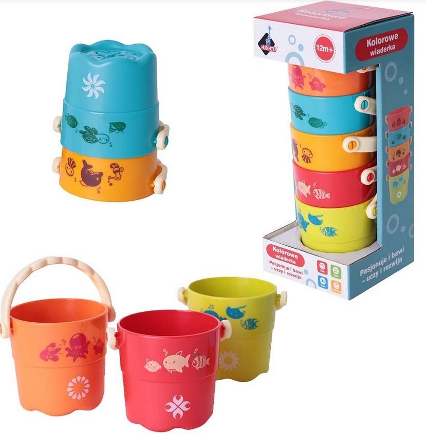 Wiaderka -kubeczki można włożyć jedno w drugie, lub zbudować wieże- co rozwija u maluchów sprawność manualną i koordynację ruchową. Dodatkowo napełnianie ich i opróżnianie, jest fajną zabawą podczas kąpieli oswaja malucha z wodą. Dna wiaderek mają dziurki, dzięki czemu eksperymentowanie i przelewanie jest jeszcze ciekawsze. Rozpoznawanie umieszczonych na ściankach wiaderek zwierzątek to tylko jedne z wielu zabaw, do jakich można wykorzystać zabawkę. Wiaderka też w pewnością przydadzą się latem do zabawy w piasku.