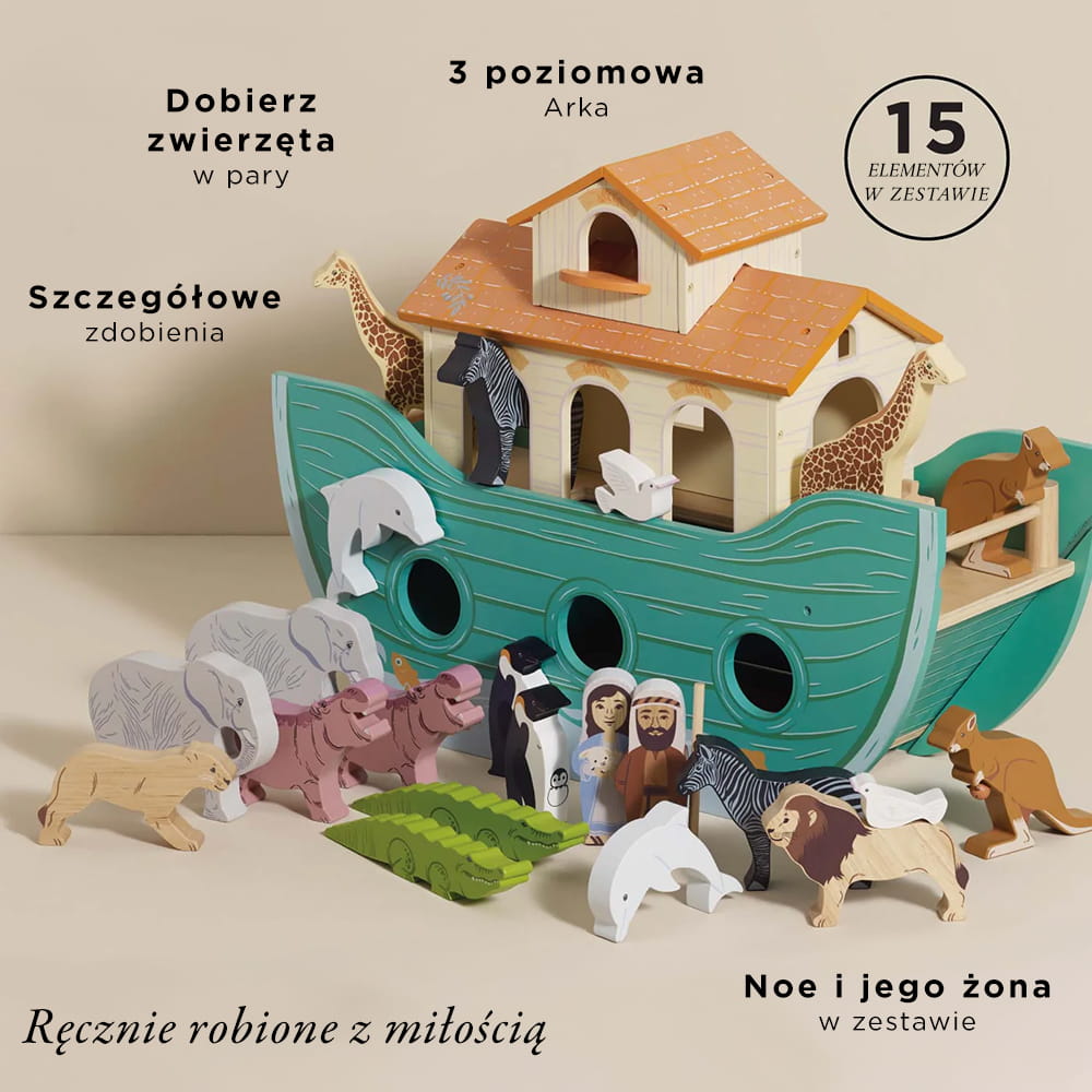 Ta drewniana Arka Noego przeniesie Twoje dziecko w krainę niekończącej się przygody. Zabawka zawiera statek - arkę, 10 par zwierzątek oraz 2 figurki - ludziki Noe i jego żona. Arka jest pięknie wykonana, zawiera ręcznie malowane detale, wyposażona w mnóstwo akcesoriów i ciekawych funkcji do odkrycia. Ta niezwykła zabawka zapewnia Twojemu dziecku długie godziny pełne radości i wspaniałej zabawy. Statek z uroczymi figurkami zachęca dziecko do opowiadania historii, rozwija jego wyobraźnię, kreatywność, koordynację ruchową, zdolności manualne i poznawcze. Wyjątkowy design sprawia, że Arka Noego stanowi wyszukaną i efektowną dekorację dziecięcego pokoju.
