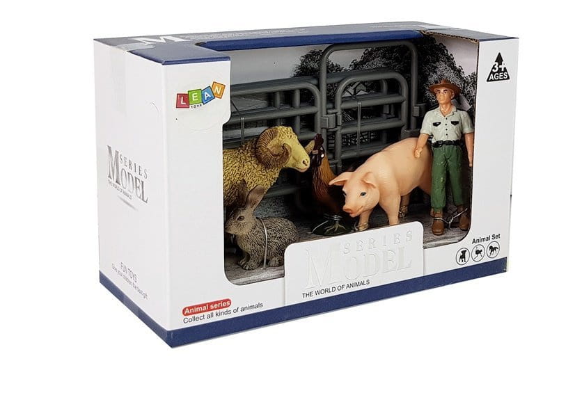 - zestaw z rolnikiem z brązową czapką ,świnką, królikiem, baranem i kogutem, ogrodzenie